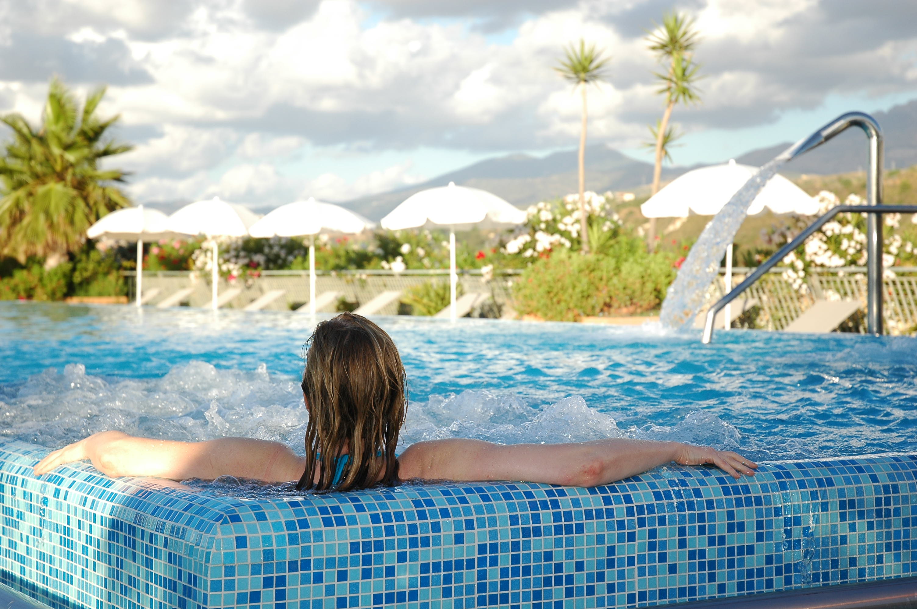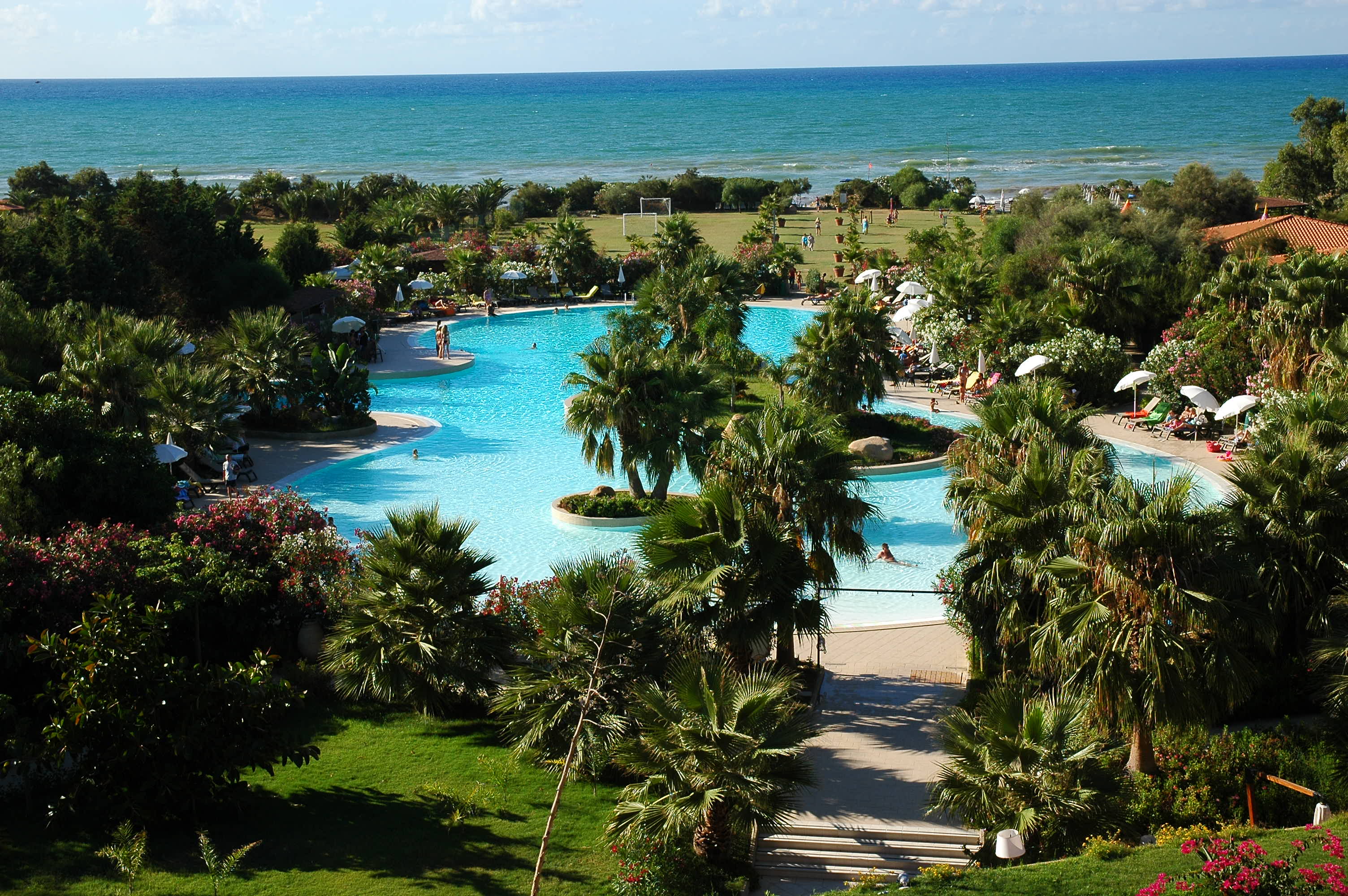 Le camere lato mare hanno tutte una confortevole loggia privata arredata con vista della grandissima piscina paesaggistica e/o parziale del mare attraverso od al disopra della rigogliosa e bellissima vegetazione tropicale del parco privato antistante.